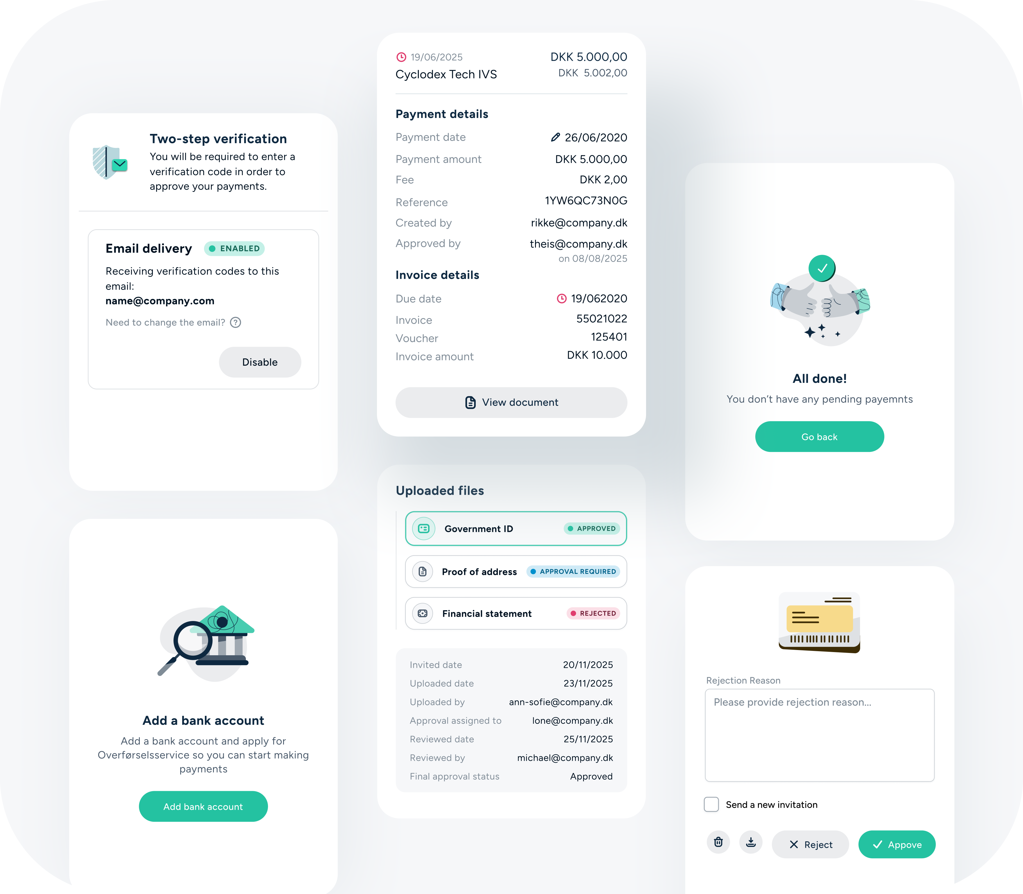 Smart Pay is a payment solution developed in collaboration between November First and the accounting system e-conomic. The goal was to enable e-conomic users to pay invoices directly from their accounting system with just a few clicks. Payments were initiated via API integration, where e-conomic managed the invoice and document interface, while November First handled secure payment approval and execution.