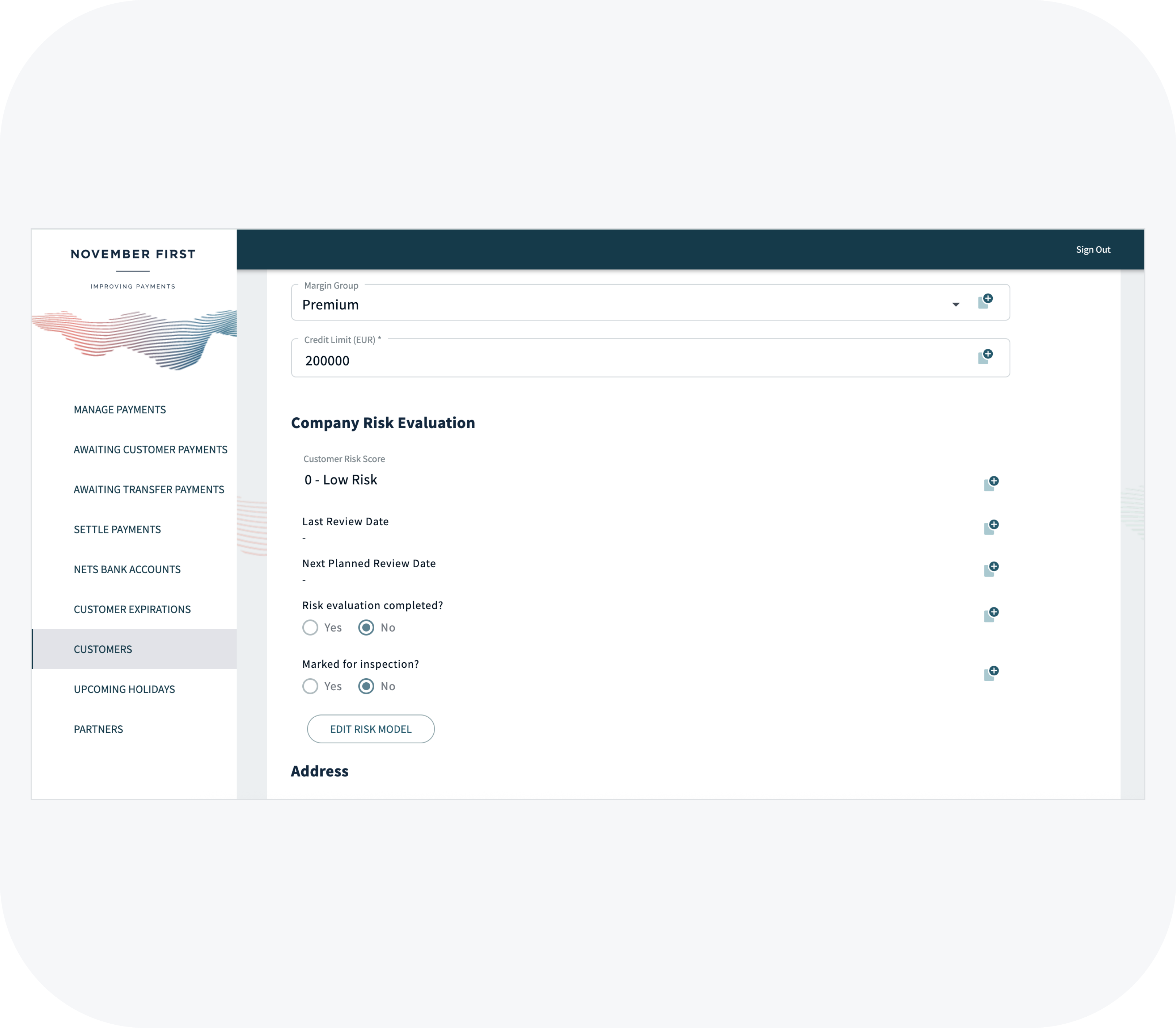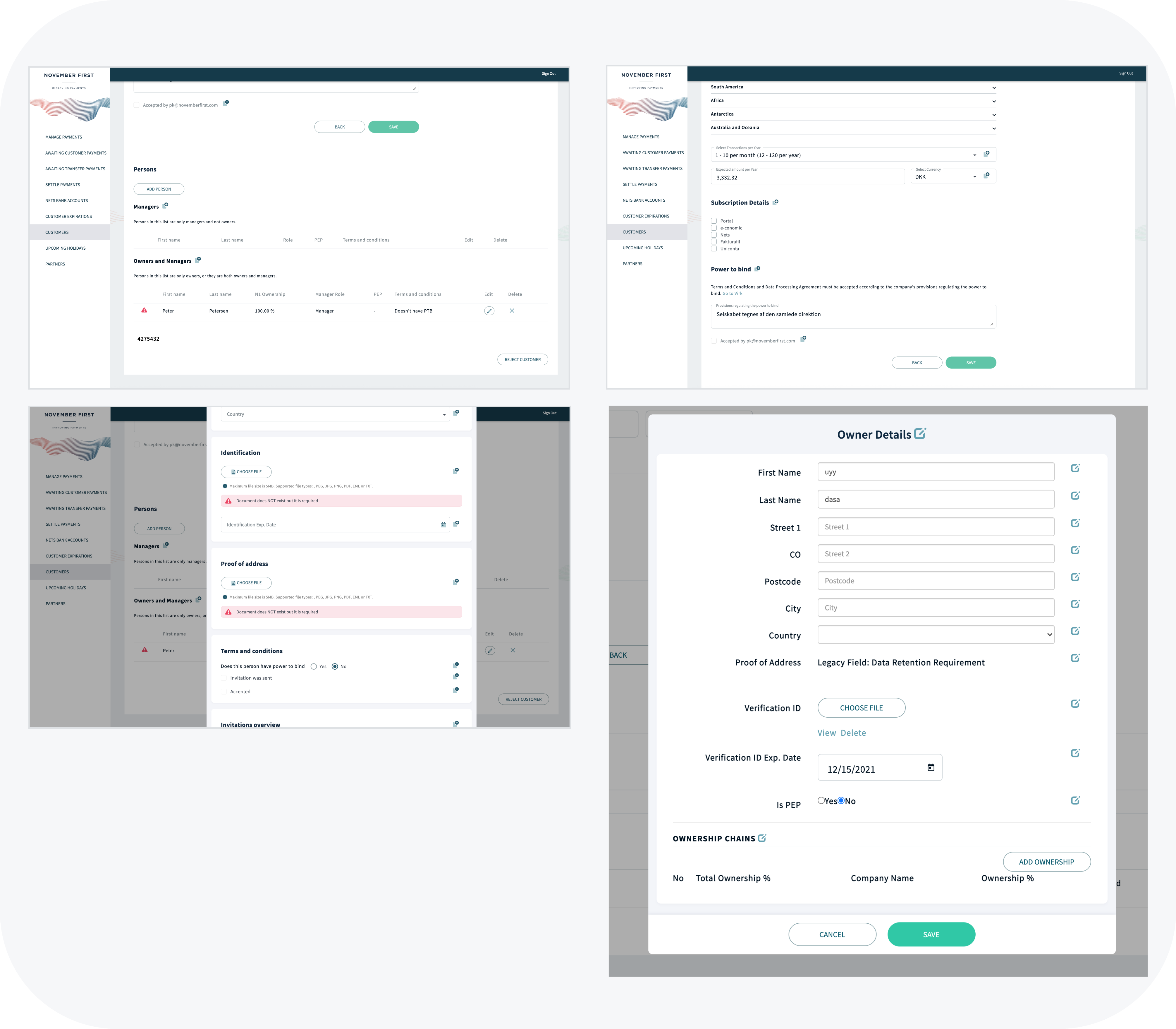 - Internal admin portal for customer management, payment management, due diligence, and risk monitoring